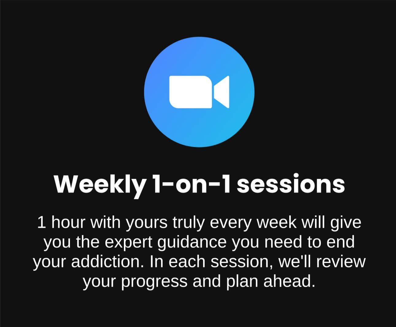 The only proven system that allows you to finally and permanently quit porn by achieving a personal transformation…One where you become the kind of man who doesn't want or need anything to do with that crap anymore.So you can leave it behind and start living the life you deserve in 60 days or less.It’s a personalized reprogramming process.Which means I’ll be with you along the way... working directly with you to create a permanent change in your life.Think of me as your personal trainer.As you know, even the best athletes in the world have a coach.LeBron James, Conor McGregor, Cristiano Ronaldo.Every single goat has a trainer, and there's a reason for that.When you need fast, reliable, and accurate results…You have to work 1-on-1 with an expert, and that's what I'm here for.We’ll work in weekly sessions.And you’ll get unlimited direct access to me (more on that in a bit).