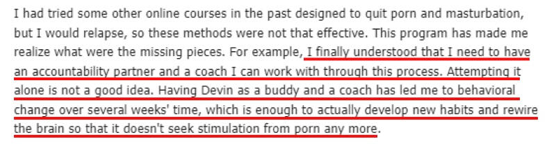 In this short article, you’ll see how you can strengthen your masculine core, quit porn forever, and start living the life of fulfillment you deserve in 60 days or less.No matter how many times you've tried to quit before.Or if you feel hopeless and think you can't.What's been happening to you can be explained with an almond, of all things...(You’ll understand why in just a moment).Read this until the end so you can absorb all the insights I have for you.And don't worry, I get it, I know the internet is full of crazy takes and BS promises.I’ve been in your position, and I know how it feels.My name is Devin McDermott.And I've created a bulletproof process for helping any man kick porn out of his life for good.(Just take a look at these screenshots).