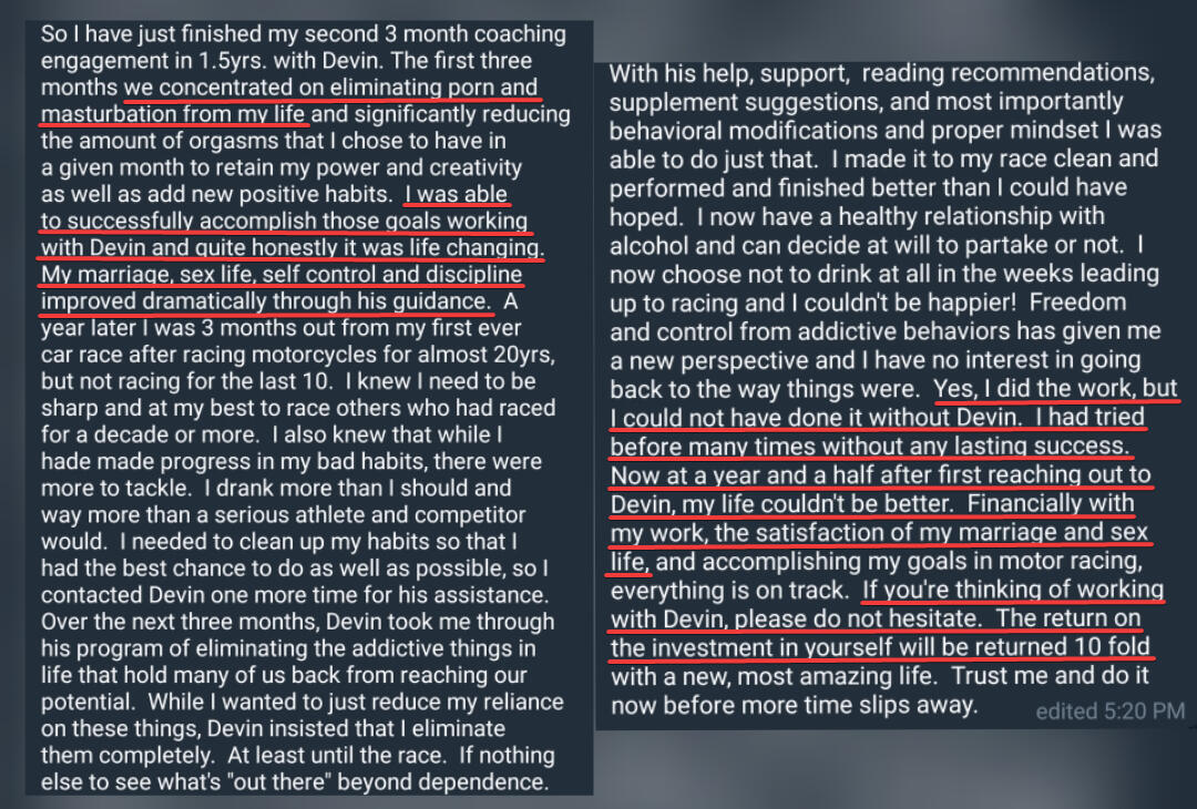 In this short article, you’ll see how you can strengthen your masculine core, quit porn forever, and start living the life of fulfillment you deserve in 60 days or less.No matter how many times you've tried to quit before.Or if you feel hopeless and think you can't.What's been happening to you can be explained with an almond, of all things...(You’ll understand why in just a moment).Read this until the end so you can absorb all the insights I have for you.And don't worry, I get it, I know the internet is full of crazy takes and BS promises.I’ve been in your position, and I know how it feels.My name is Devin McDermott.And I've created a bulletproof process for helping any man kick porn out of his life for good.(Just take a look at these screenshots).